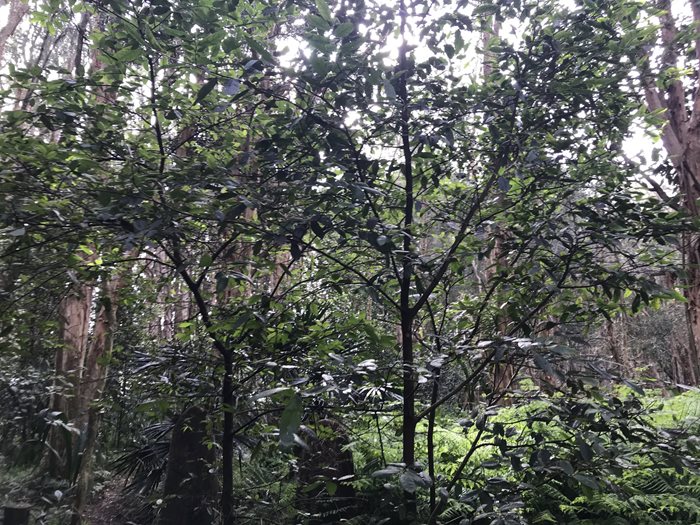 Location: As you walk along the boardwalk, look eye height on your left for an understory plant with dark green rough looking leaves. This tree will one day become a canopy species.