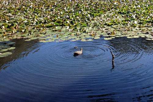 It is against Parklands Regulations to ‘bathe, wade, wash or swim, or operate a boat, canoe, kayak or any other water craft or vessel or flotation device, in any lake, pond or stream or in any ornamental water’. Dogs should not go in the water and must be on a leash within 10m of the ponds.
